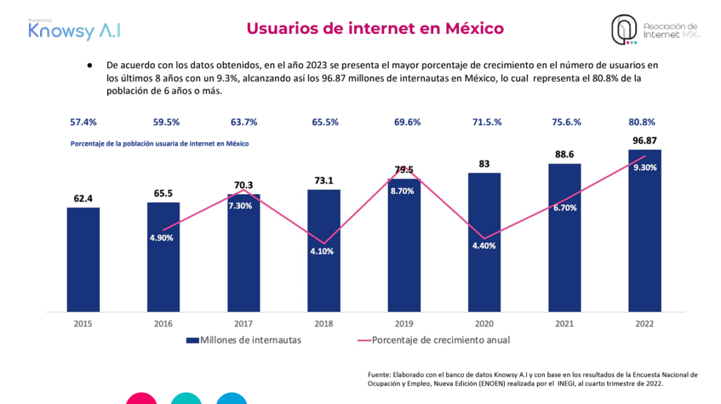 El crecimiento del Internet en México ha sido vertiginoso. Según datos de la Asociación de Internet MX de acuerdo al 19° Estudio sobre los hábitos de los usuarios de Internet en México 2023, aproximadamente el 80.8% de la población mexicana cuenta con acceso a Internet. Esto representa un aumento significativo en comparación con años anteriores y es un reflejo de la creciente penetración de la conectividad en el país. Esta expansión ha sido impulsada por factores como la disminución de costos de los servicios de Internet y la mayor disponibilidad de dispositivos móviles.