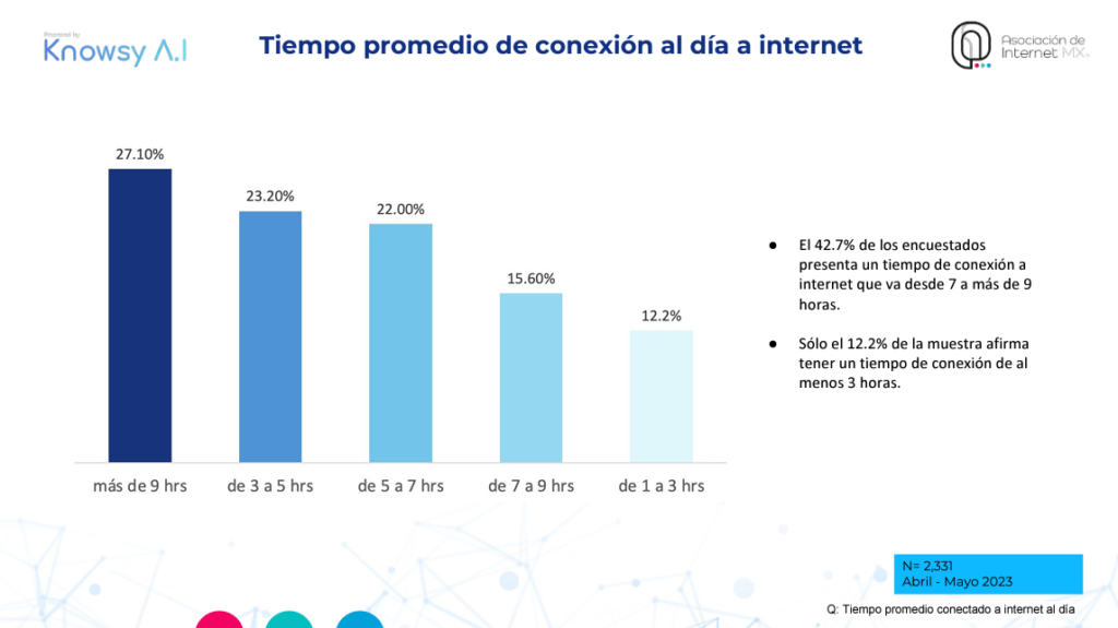 Otro de los rasgos es el tiempo promedio que dedicamos a la navegación de contenidos en internet, donde destaca que el 27.10% de los usuarios utilizan más de 9 horas en promedio de navegación, mientras que solo el 12.2% lo utiliza en un promedio entre 1 y 3 horas.